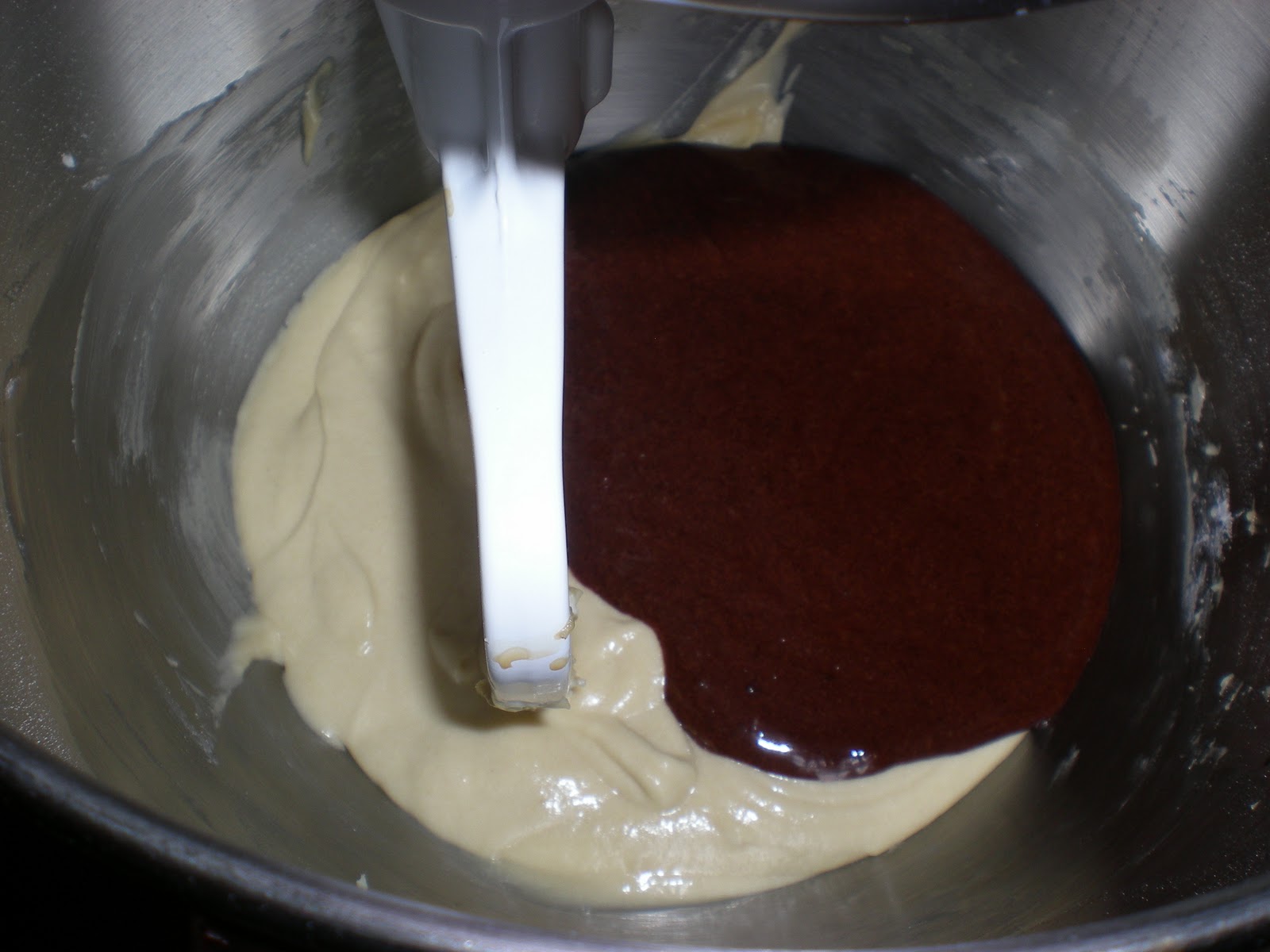 In your electric mixer fitted with the paddle attachment, cream your brown sugar with the butter. Add the remaining yolk. Mix in your flour mixture in batches, alternating with ¼ cup water, ¼ cup milk, and almond and vanilla extracts. Next add your chocolate mixture.
